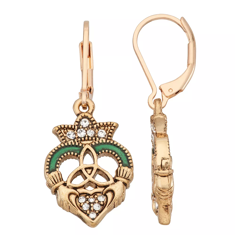 Showcase love and friendship with these lovely Napier Gold Tone Lucky Leprechaun Claddagh Drop Earrings.